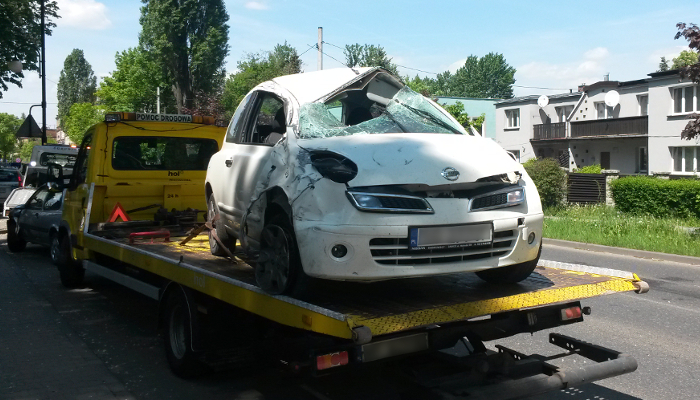 Kierowca białego nissana wyprzedzał na oznakowanym przejściu dla pieszych. Podczas manewru zahaczył o inny pojazd, po czym dachował. 70-letni kierowca nissana stracił prawo jazdy. Na miejscu zabrali mu je policjanci.