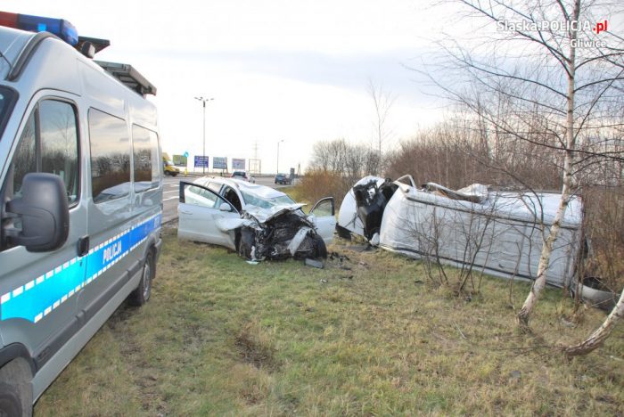 Ze wstępnych ustaleń wynika, że jadący od strony Rybnika samochód dostawczy wpadł w poślizg i zderzył się czołowo ze skodą superb.