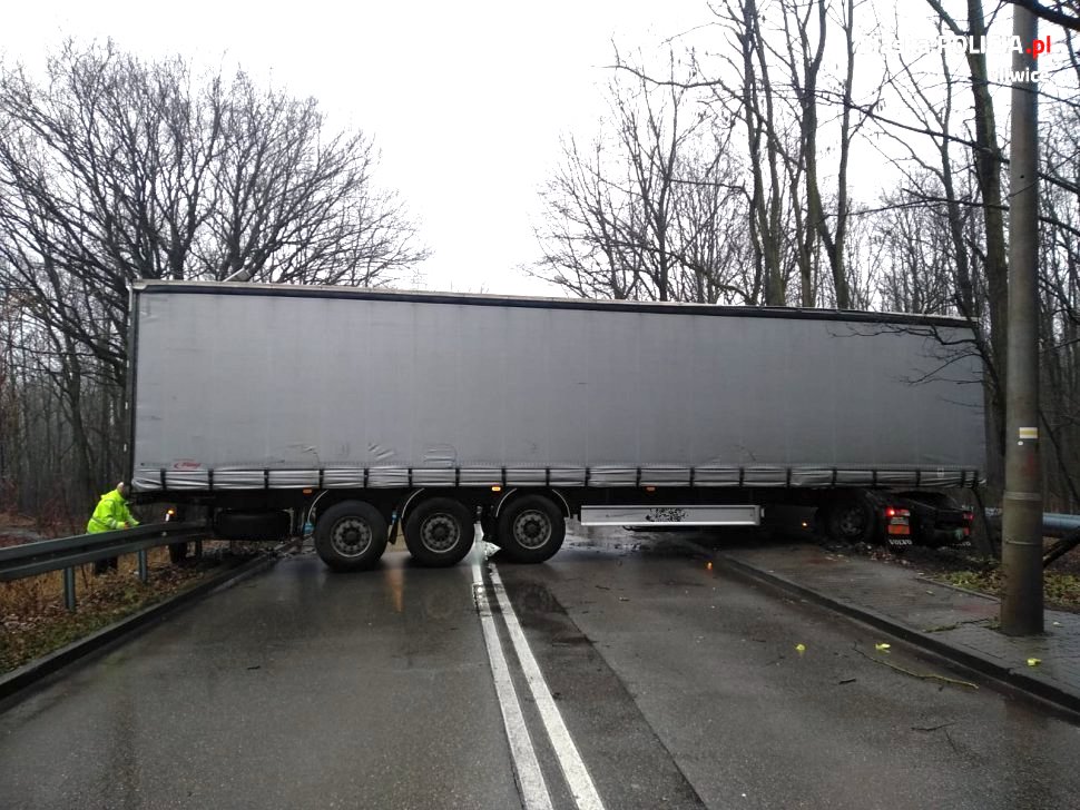 Tuż przed godziną 7.00 kierujący pojazdem ciężarowym stracił panowanie nad ciężkim pojazdem i wypadł z drogi, stając w poprzek.