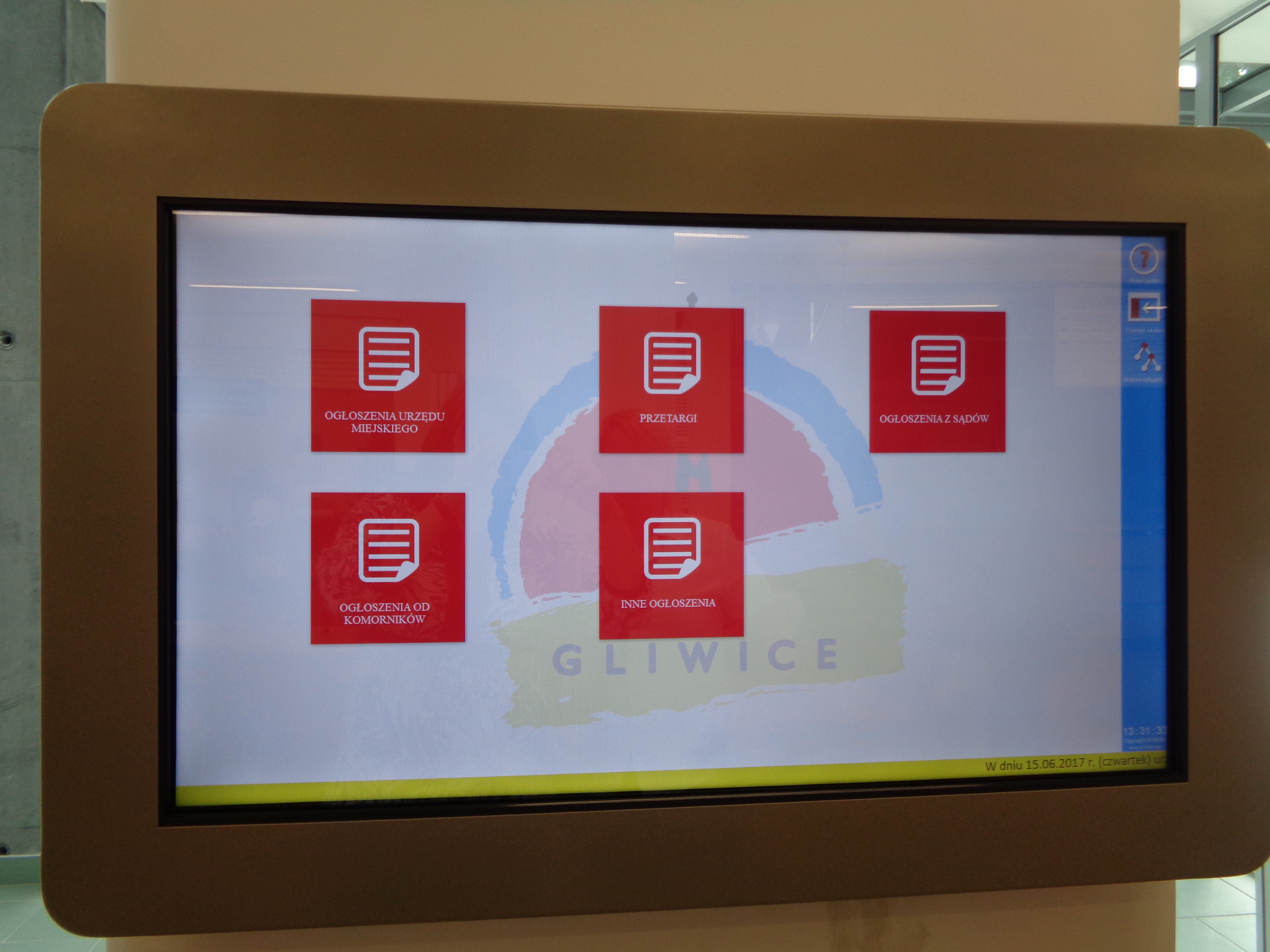 Tablica działa jak typowy tablet czy smartfon. Cała nawigacja odbywa się przez dotyk. Szukając konkretnej informacji, mamy do wyboru pięć czerwonych „kafli” („Ogłoszenia Urzędu Miejskiego”, „Przetargi”, „Ogłoszenia z sądów”, „Ogłoszenia od komorników”, „Inne ogłoszenia”), które po dotknięciu przenoszą nas do szczegółów wybranej kategorii. Układ publikowanych ogłoszeń jest czytelny, istnieje też możliwość powiększania fragmentu tekstu.