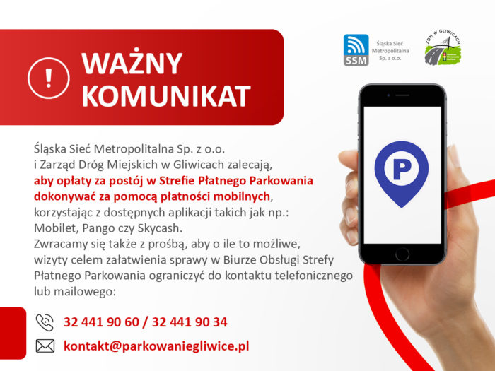 Śląska Sieć Metropolitalna Sp. z o.o. i Zarząd Dróg Miejskich w Gliwicach zalecają, aby opłaty za postój w Strefie Płatnego Parkowania dokonywać za pomocą płatności mobilnych, korzystając z dostępnych aplikacji takich jak np.: Mobilet, Pango czy Skycash.